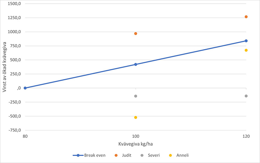 Eftersom odlingskostnaden ökar med 420:- per stege (blå linje) måste merskördens värde överstiga det. Diagrammet nedan visar att det endast var för Judit som avkastningen ökade tillräckligt för att betala insatsen, men med låg marginal. Även fast Anneli avkastade mer vid 120 kg N så var det inte tillräckligt för att täcka kostnaden för den högre kvävegivan.
